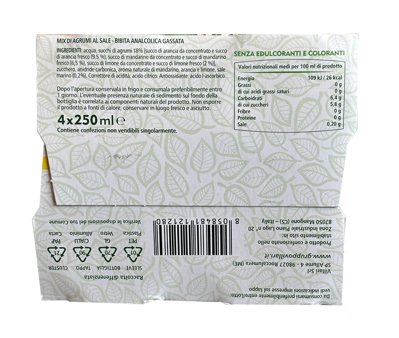 Lasciati conquistare dal gusto sorprendente della Fior di Sale al Mix di Agrumi Lumì , una bevanda frizzante che racchiude l’essenza autentica degli agrumi siciliani: limone, arancia e mandarino. Il carattere dolce e vivace degli agrumi si unisce alla nota minerale e raffinata del Fior di Sale dei mari di Sicilia , creando un equilibrio aromatico unico e irresistibile. Questa bibita, parte della prestigiosa Linea Fior di Sale Lumì, è pensata per chi cerca un’esperienza gustativa fresca, naturale e diversa dal solito. Con solo 26 kcal per 100 ml e una ricetta senza conservanti né coloranti , rappresenta una scelta genuina e leggera, perfetta per chi ama gustare senza rinunciare al benessere. Servila fredda o ghiacciata .