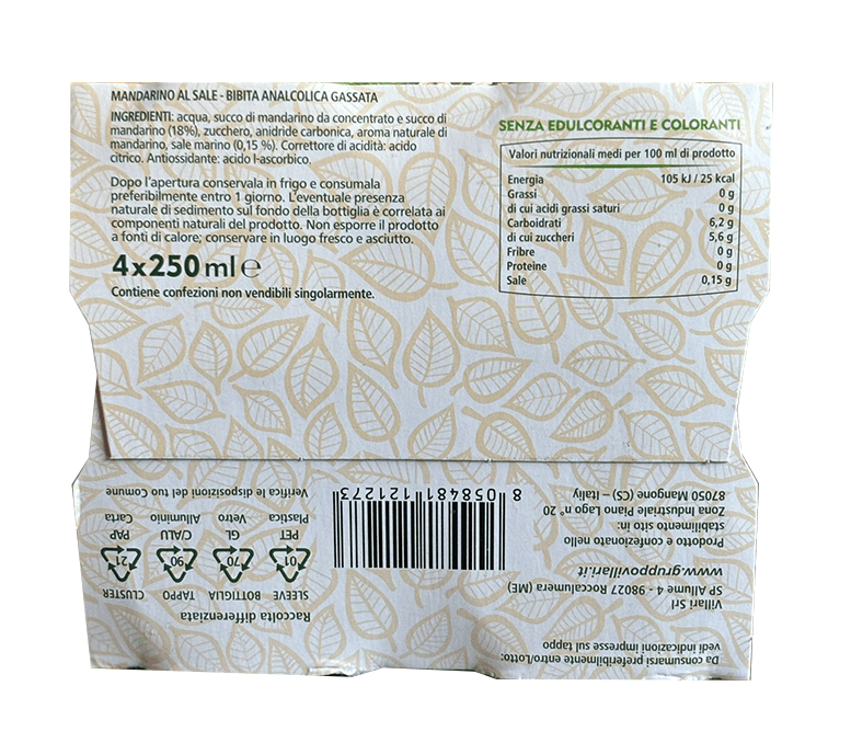 Scopri il gusto sorprendente della Fior di Sale al Mandarino Lumì , una bevanda unica che unisce la dolcezza agrumata dei migliori mandarini siciliani al carattere minerale del prezioso Fior di Sale dei mari di Sicilia . Parte della prestigiosa Linea Fior di Sale, questa bibita offre un’esperienza sensoriale raffinata e fuori dal comune, perfetta per chi cerca qualcosa di autentico e diverso dalle solite bevande. La sua freschezza naturale nasce dalla qualità delle materie prime : mandarini siciliani selezionati e Fior di Sale, che aggiunge un tocco sapido e una piacevole profondità al gusto. Con sole 25 kcal per 100ml e senza conservanti né coloranti , è una scelta genuina e leggera, ideale per il benessere quotidiano. Frizzante, equilibrata e vivace: perfetta da gustare ghiacciata per apprezzarne tutta la sua intensità.