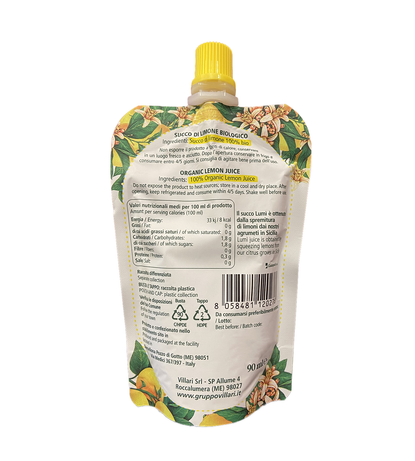 Il Succo di limone Lumì BIO nasce dalla spremitura diretta di limoni freschi coltivati in Sicilia: un processo che conserva intatte le proprietà nutritive del frutto, senza utilizzare succo concentrato. Il risultato è un succo 100% naturale e certificato biologico, privo di zuccheri aggiunti, additivi e coloranti — la scelta ideale per chi desidera un prodotto genuino e salutare. Perfetto da usare nella preparazione di bevande, condimenti, tisane o come ingrediente versatile in cucina. Al mattino per dare energia alla giornata, prima dei pasti per favorire la digestione, durante l’attività fisica per rinfrescare e reintegrare oppure la sera per un momento di relax – questo succo offre supporto nutritivo grazie alla vitamina C e agli antiossidanti naturali presenti nei limoni biologici. Formato: pouch da 90 ml. Conservare in luogo fresco e asciutto. Dopo l’apertura, conservare in frigorifero e consumare entro 4-5 giorni.